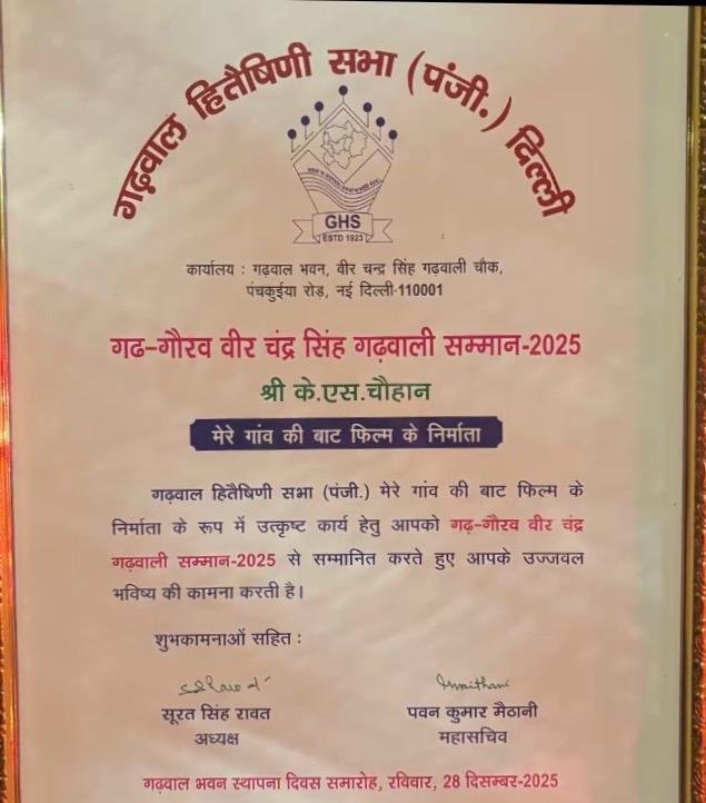 दिल्ली के गढ़वाल भवन में 67वें स्थापना दिवस पर जौनसारी भाषा की पहली फिल्म “मैरे गांव की बाट” को 2023-24 की सर्वश्रेष्ठ उत्तराखंडी फिल्म का अवॉर्ड मिला। फिल्म के निर्माता-निर्देशक को “गढ़ गौरव वीर चंद्र सिंह गढ़वाली सम्मान-2025” दिया गया। यह सम्मान जौनसारी संस्कृति, सामाजिक मूल्यों और परंपराओं को सिनेमा के जरिए शानदार तरीके से दिखाने के लिए मिला। वक्ताओं ने कहा कि उत्तराखंड की लोकल फिल्में राज्य की भाषाओं, संस्कृति और समस्याओं को देशभर में पहचान दिला रही हैं। इनसे लेखक, कलाकार और तकनीशियनों के लिए नए रोजगार के मौके भी बन रहे हैं।